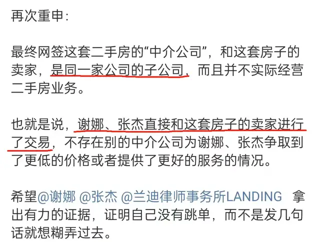 恰巧在这之后,该公司也声明称,未与张杰谢娜方产生交易,该房源并非由本公司操作。这样的回应似乎“实锤”了张杰谢娜方的跳单行为,毕竟中介公司都否认参与操作了,除了直接和房东购买还有别的方法吗?