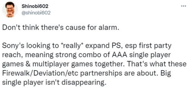 对此,业内人士602认为索尼目前正在积极拓展PlayStation业务范围,尤其是第一方游戏,这在一定程度上意味着索尼未来将制作更多的3A单机游戏和多人游戏组合,这也是索尼投资第三方游戏工作室的原因。