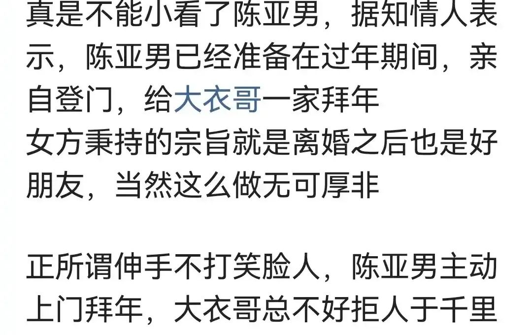 陈亚男与朱家和解了,还要去给大衣哥一家拜年,大衣哥也回应称,将会好好招待。这到底是怎么回事?难道说两家关系一直都很好?此前发生的一系列事情全是误会?