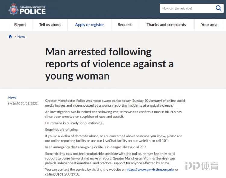 曼彻斯特警方在公告中表示:在今天早些时候,一名女性通过发布照片和视频的方式宣称自己遭到了暴力殴打,对此我们已经展开调查,经过询问,我们可以确定一名二十岁左右的男子因涉嫌强奸和殴打被捕。目前他仍然在拘留并接受问询,调查仍在进行中。