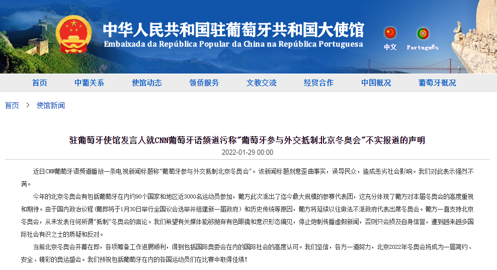 据中国驻葡萄牙大使馆网站消息,近日CNN葡萄牙语频道播放一条电视新闻标题称“葡萄牙参与外交抵制北京冬奥会”。该新闻标题刻意歪曲事实,误导民众,造成恶劣社会影响。我们对此表示强烈不满。