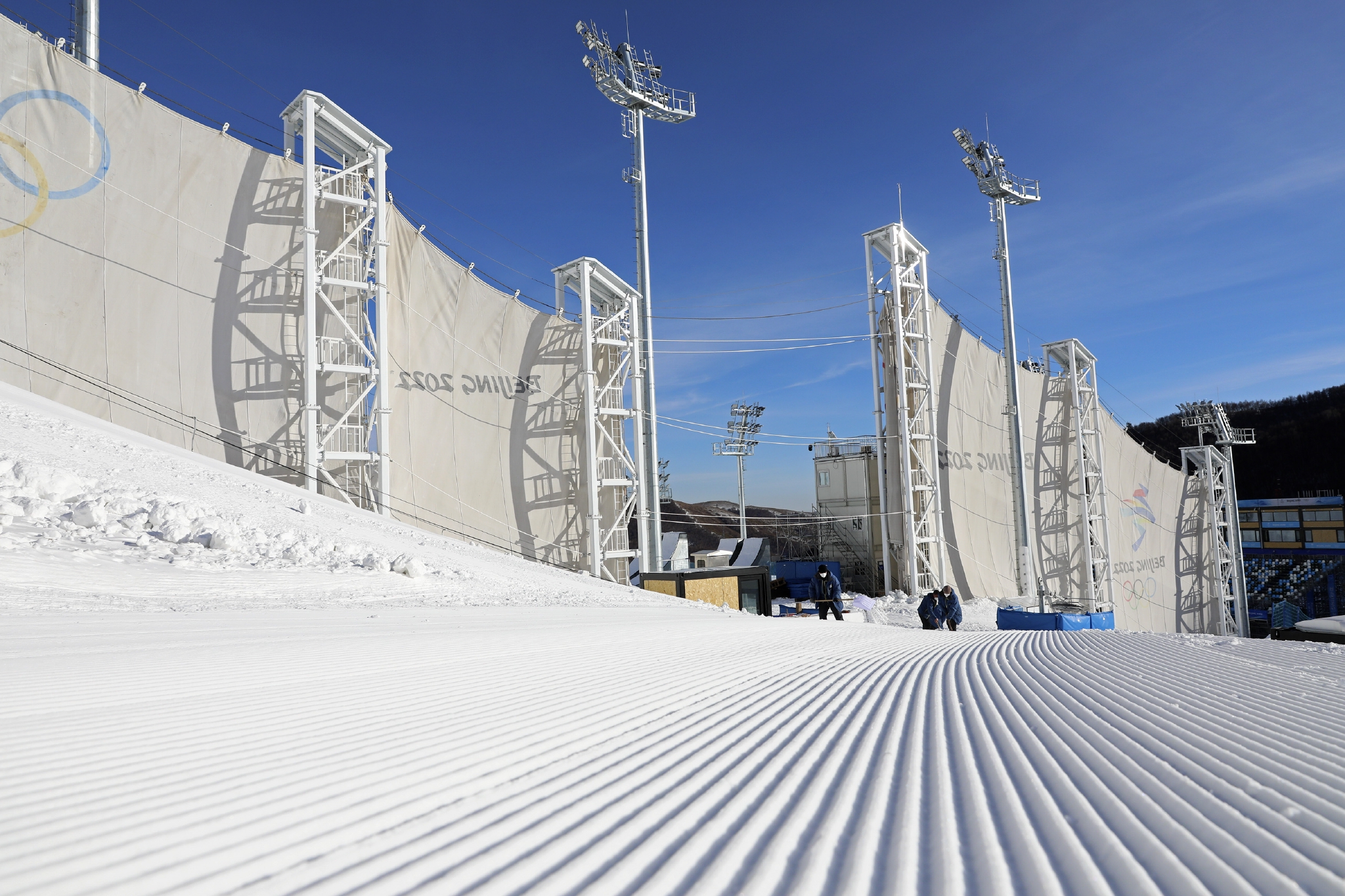 1月19日,工作人员在张家口赛区云顶滑雪公园防风墙旁平整雪道。新华社发(武殿森 摄)
