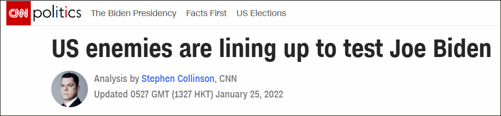 CNN分析文章:美国“敌人”正排着队考验拜登“拜登正面临着一系列彼此不同但相互关联的全球危机和热点问题。”CNN在文章一开始,就给拜登政府四处插手他国事务洗白,称是美国的“敌人”正轮番来测试美国是不是正在衰退。